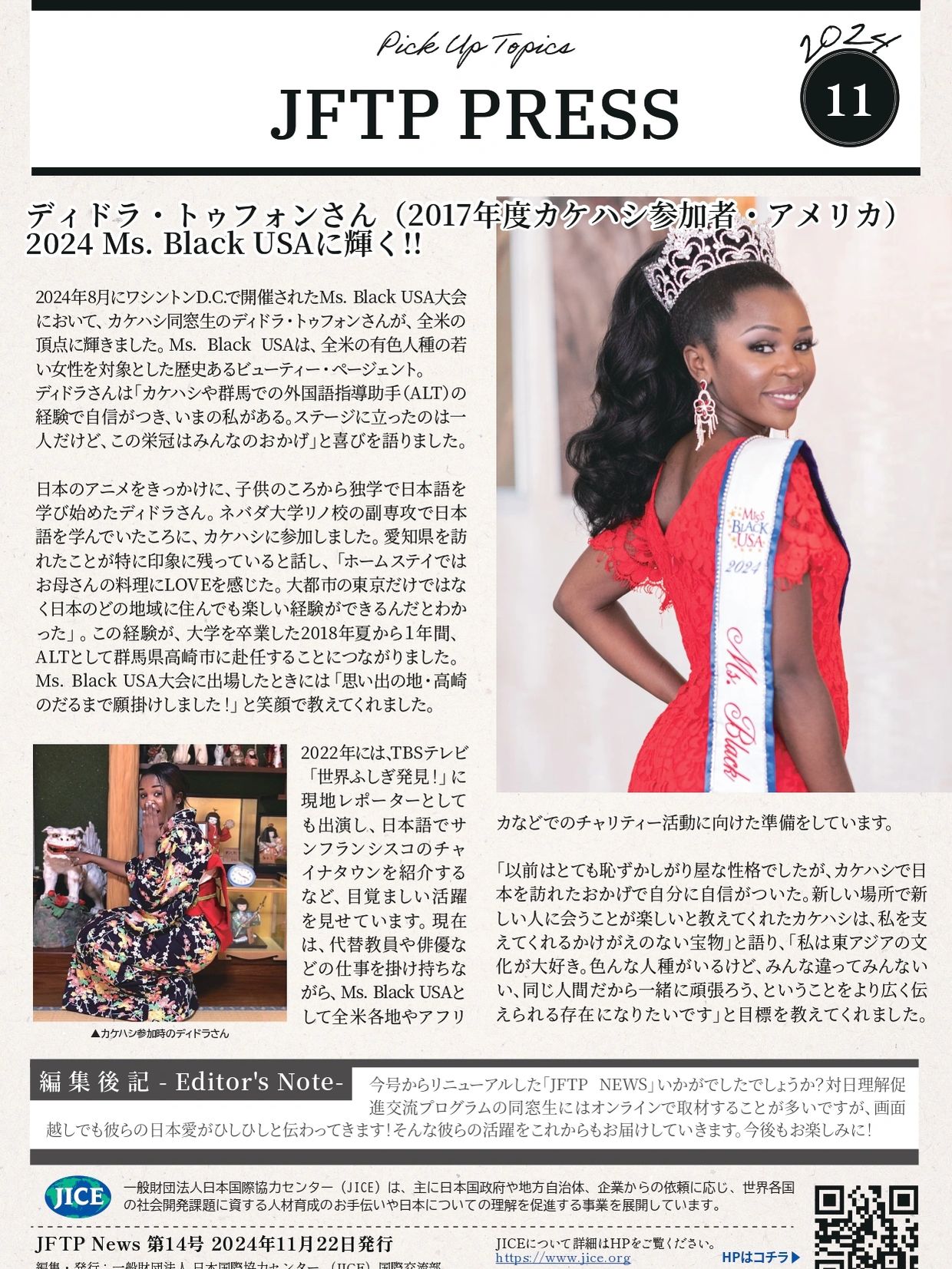 2024年には「ミス・ブラックUSA」に選出され、JICE(国際交流基金)からインタビューを受け、日本が自身の成長に果たした役割について語りました。2025年現在は松山・サクラメント姉妹都市協会の正式メンバーとして、日米の架け橋になることを目指しています。現在は夫とともにカリフォルニア州サクラメントに在住し、日本語能力試験N2の合格に向けて準備を進めています。