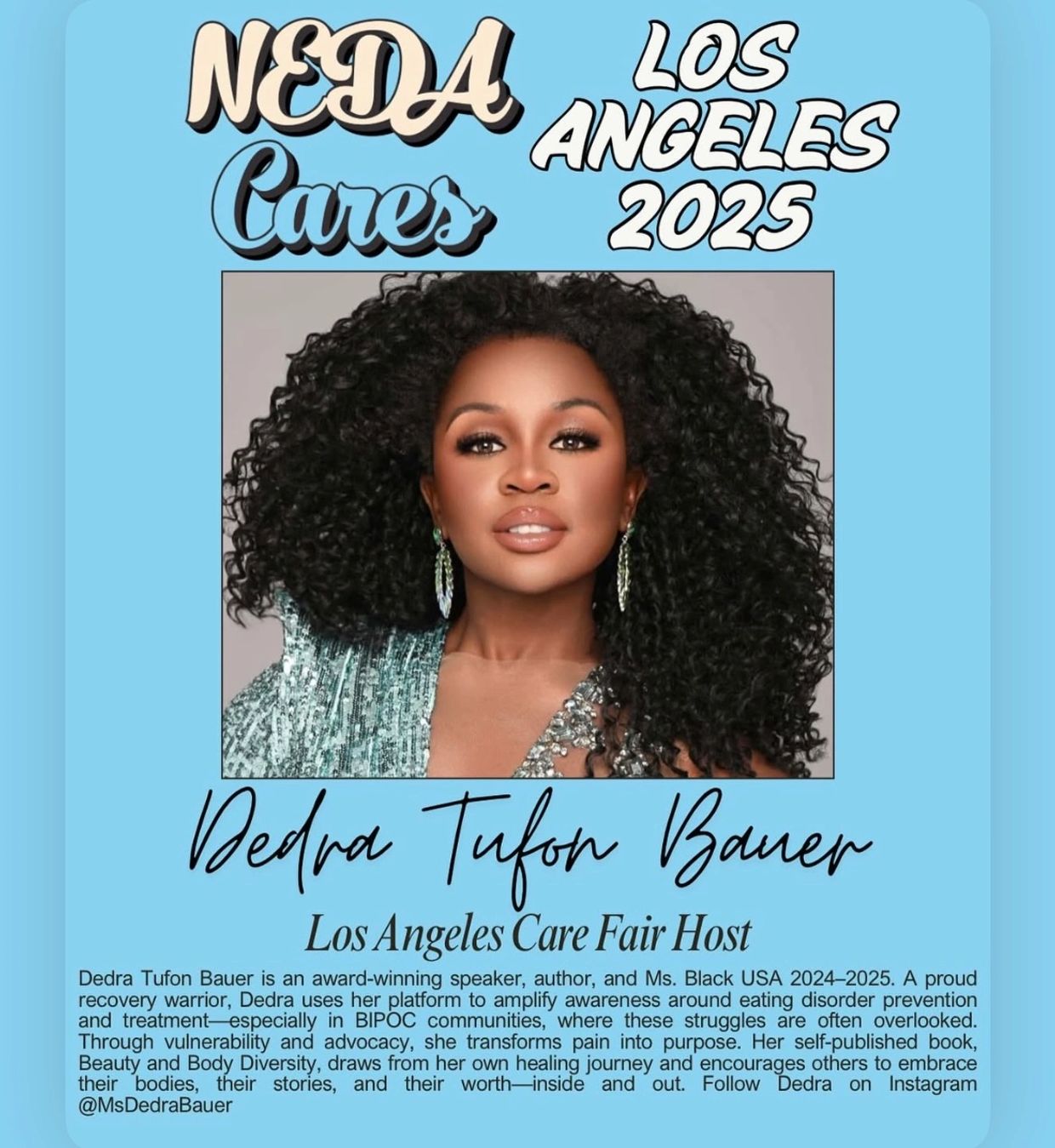 In recognition of her impactful advocacy, Dedra was named an official collaborator with the National Eating Disorders Association (NEDA), a milestone that underscores her commitment to awareness, education, and systemic change. In 2025, she was invited as an honored guest to the NEDA Gala in New York City, where she stood alongside other changemakers in the fight for eating disorder prevention and recovery. Her presence at the event, both as a survivor and a leader, represents a growing movement to uplift voices historically excluded from the conversation—and to affirm that healing belongs to everyone.